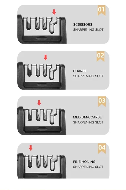 1. حادّ السكاكين مصمم بفتحات شحذ بنظام شحذ ثلاثي/رباعي مراحل، مصنوع من حجر السيراميك، وألواح كربيد التنجستن، وأعمدة الماس. حادّ السكاكين آمن وغير قابل للانزلاق، تصميم المقبض المريح والقاعدة المضادة للانزلاق يجعل الحادّ مريحًا للغاية في الاستخدام.